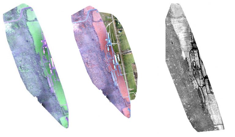 下圖展示了基于近紅外、綠光、藍(lán)光三波段相機(jī)的拍攝結(jié)果(偽彩色),可以區(qū)分下墊面不同土地利用類型的面積、其中最右側(cè)為基于光譜計(jì)算的NDVI(歸一化植被字?jǐn)?shù)),用于表征植被的葉綠素水平、葉面積指數(shù)及生長(zhǎng)狀況,初略地講,顏色越深表示植被生長(zhǎng)狀況越佳。